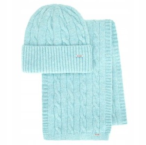 Ten damski komplet zimowy - czapka i szalik - to niezbędny element garderoby na chłodne dni. Wykonany z miękkiej i elastycznej mieszanki poliestru, akrylu oraz elastanu, doskonale łączy styl z komfortem. Elastyczna czapka z wywijanym ściągaczem idealnie dopasowuje się do kształtu głowy, gwarantując ciepło i wygodę przez cały dzień. Klasyczny splot warkoczowy dodaje zestawowi ponadczasowego uroku, który świetnie dopełni zarówno casualowe, jak i bardziej eleganckie stylizacje.
