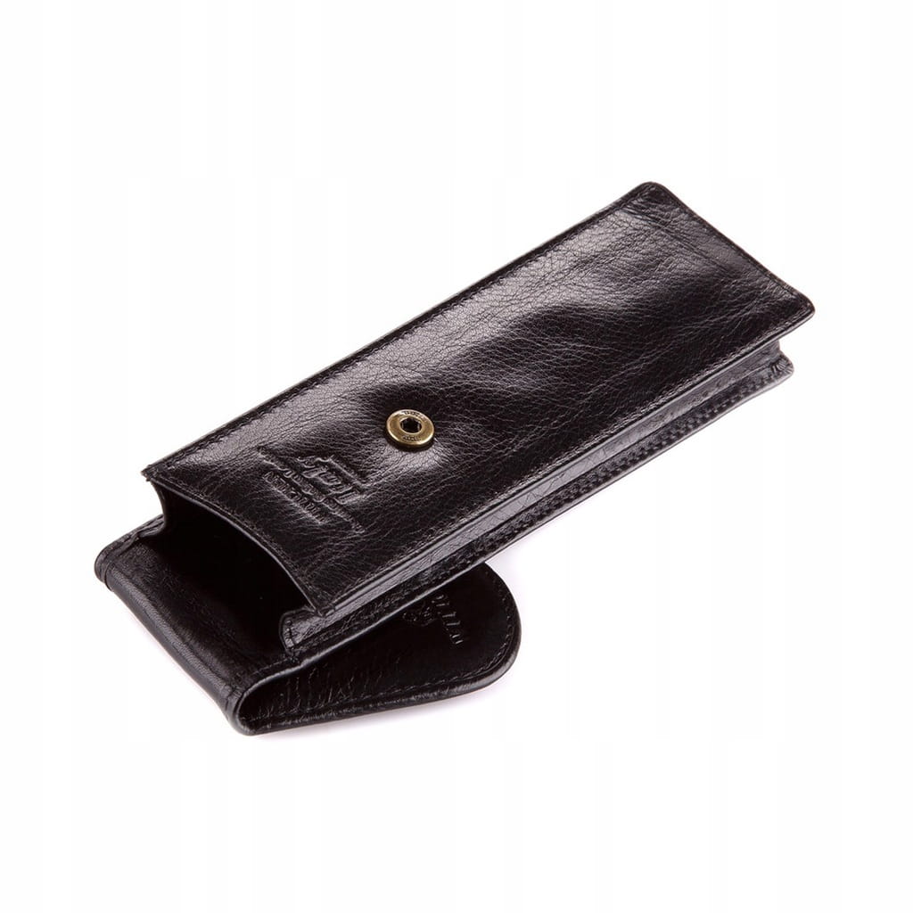 Skórzane czarne etui na długopisy WITTCHEN 21-2-169-1 z kolekcji Italy wykonane z miękkiej skóry bydlęcej idealnie chroni przybory do pisania przed uszkodzeniem. We wnętrzu znajduje się dwa miejsca na długopisy. Etui jest bardzo wygodne i praktyczne dzięki niewielkim rozmiarom. Zdobi je logo w postaci herbu Wittchen wytłoczonego w skórze. Etui zapakowane jest w ekskluzywne pudełko sygnowane logo WITTCHEN.