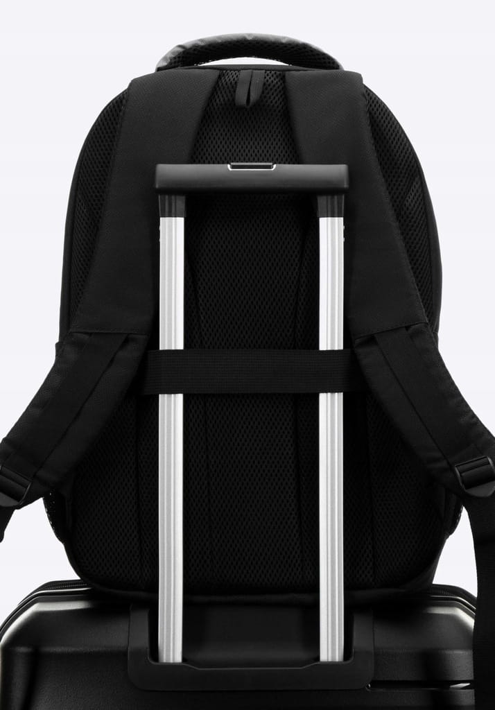 - Uchwyt na walizkę: Pionowy pas umożliwia łatwe mocowanie plecaka na stelażu walizki, co pozwala odciążyć plecy.