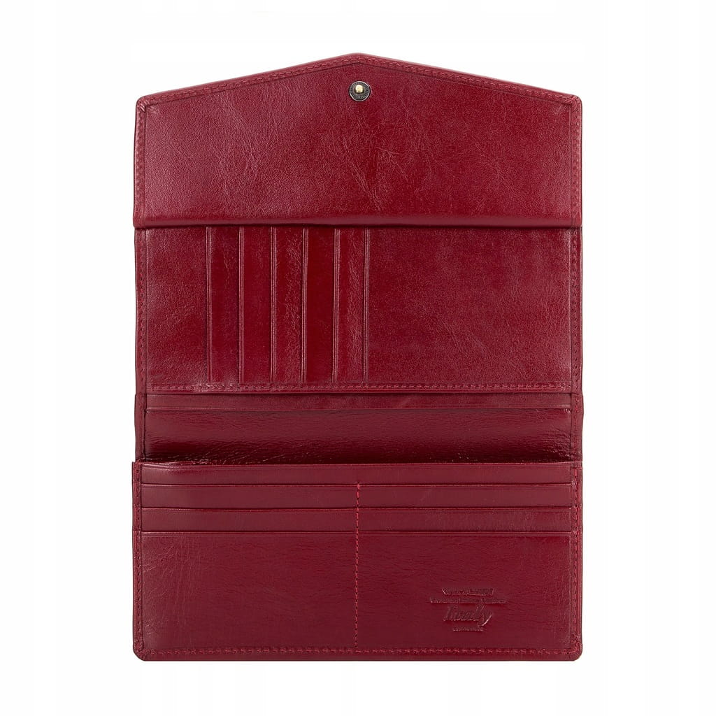 Poznaj dużą portmonetkę damską z klapą w stylu kopertówki, stworzoną dla kobiet, które cenią elegancję, porządek i najwyższą jakość. Wykonana z miękkiej skóry naturalnej, zachwyca subtelnym połyskiem i luksusowym wykończeniem, łącząc klasyczny design z funkcjonalnością. Dzięki przemyślanemu układowi wnętrza pozwala wygodnie przechowywać wszystkie niezbędne dokumenty, karty i gotówkę, pozostając przy tym stylowym dodatkiem do torebki.