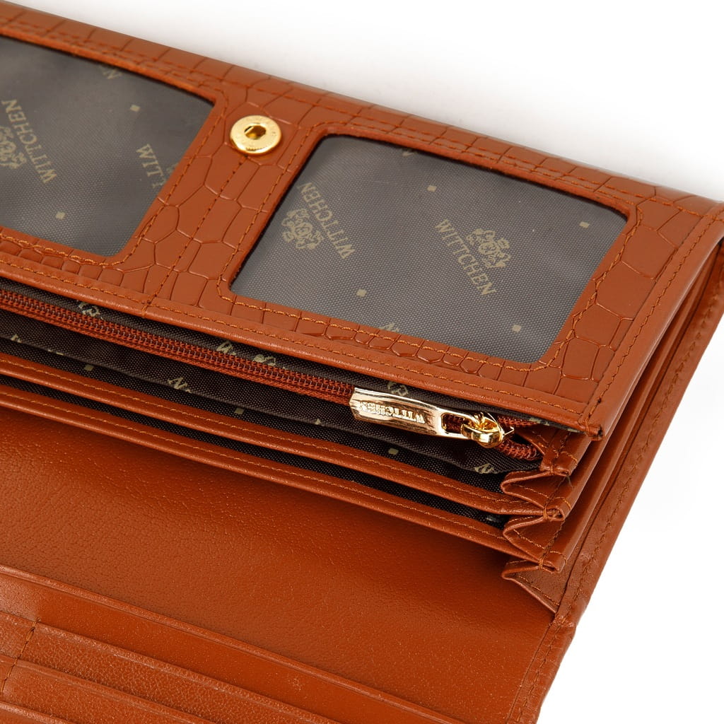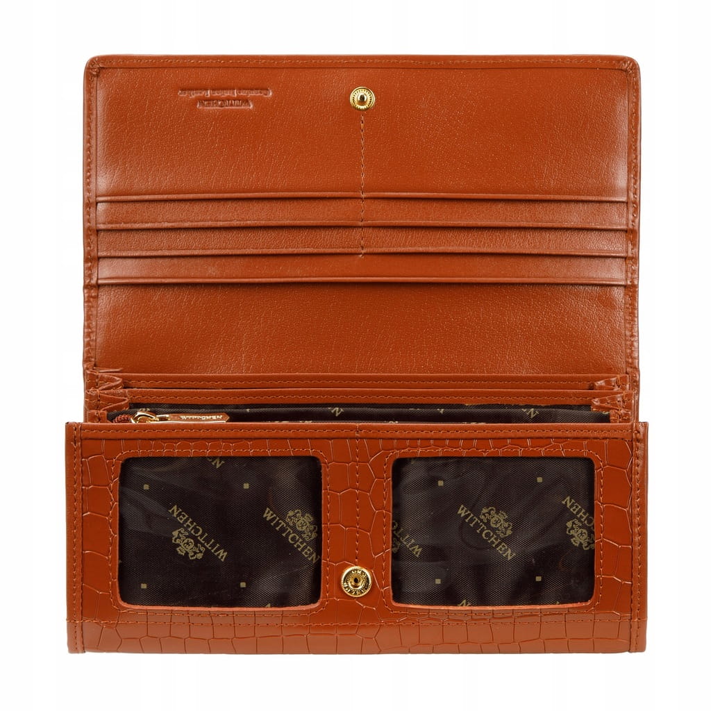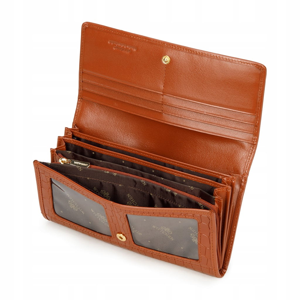 Ten portfel to stylowy dodatek dla każdej kobiety. Jest duży i pojemny, a przy tym bardzo elegancki. Wykonany został z wysokiej jakości skóry naturalnej o fakturze croco, którą dodatkowo zdobi metalowe logo WITTCHEN. Ten model jest w środku świetnie zorganizowany: ma wiele miejsc na karty, otwartych kieszeni (w tym dwie przezroczyste), kieszonkę na bilon zapinaną na suwak i przegródkę na banknoty. Wyposażono go w specjalną podszewkę, która chroni karty przed sczytywaniem danych (RFID). Portfel damski ze skóry croco poziomy to ponadczasowy dodatek i pomysł na gustowny prezent.