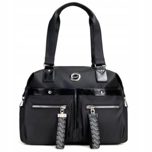Z przodu torebki srebrno-czarne logo marki i cztery kieszenie - dwie otwarte i dwie zamykane na suwak z ozdobnym, logowanym brelokiem.