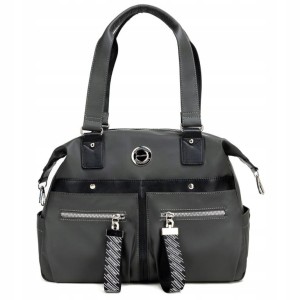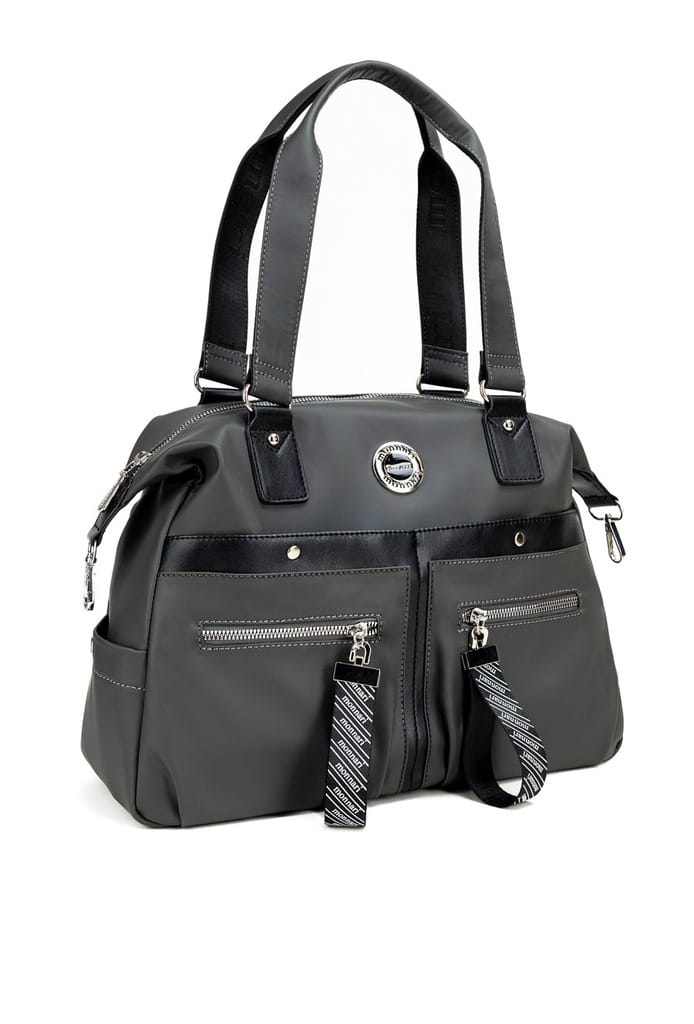 Z przodu torebki srebrno-czarne logo marki i cztery kieszenie - dwie otwarte i dwie zamykane na suwak z ozdobnym, logowanym brelokiem.